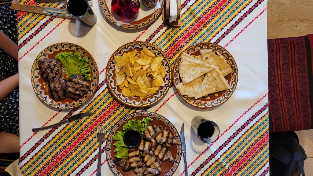 Bulgarian food is hearty, featuring a lot of grilled meats, and yoghurt. It’s also quite cheap. I can’t think of anything bad to say about Bulgarian food.
